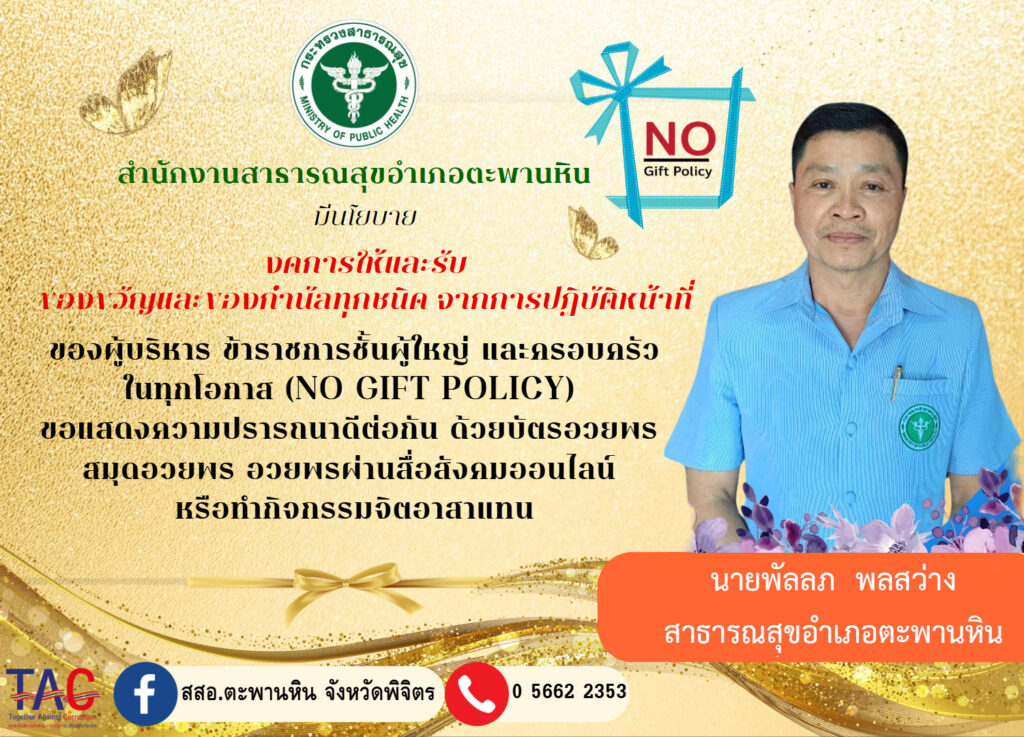 กระทรวงสาธารณสุข สำนักงานสาธารณสุขอำเภอตะพานหิน มีนโยบายงดการให้และรับของขวัญและของกำนัลทุกชนิด จากการปฏิบัติหน้าที่ของผู้บริหาร ข้าราชการชั้นผู้ใหญ่ และครอบครัวในทุกโอกาส (No Gift Policy) ขอให้แสดงความปรารถนาดีต่อกันด้วยบัตรอวยพร สมุดอวยพร อวยพรผ่านสื่อสังคมออนไลน์ หรือทำกิจกรรมผ่านจิตอาสาแทน